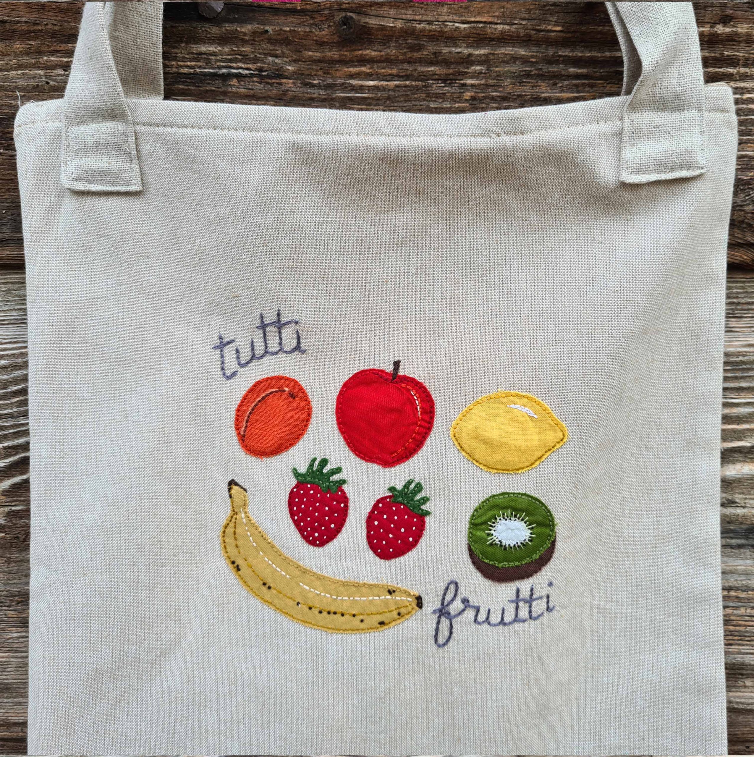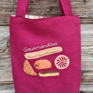 Les tissus (de seconde main) sont fournis, de même que le matériel de mercerie (fils à broder). Un gabarit permet aux participants de reporter le modèle de leur choix (parmi les trois proposés) sur le tissu qu’ils ont sélectionné. Ils dessinent (toujours à l’aide du gabarit) et découpent ensuite les différentes formes qu’ils apprennent à fixer sur le tissu (au point de piqûre). Deux autres points de broderie leur permettent de compléter les motifs. Une fois la partie décorative terminée, le sac est assemblé et cousu.